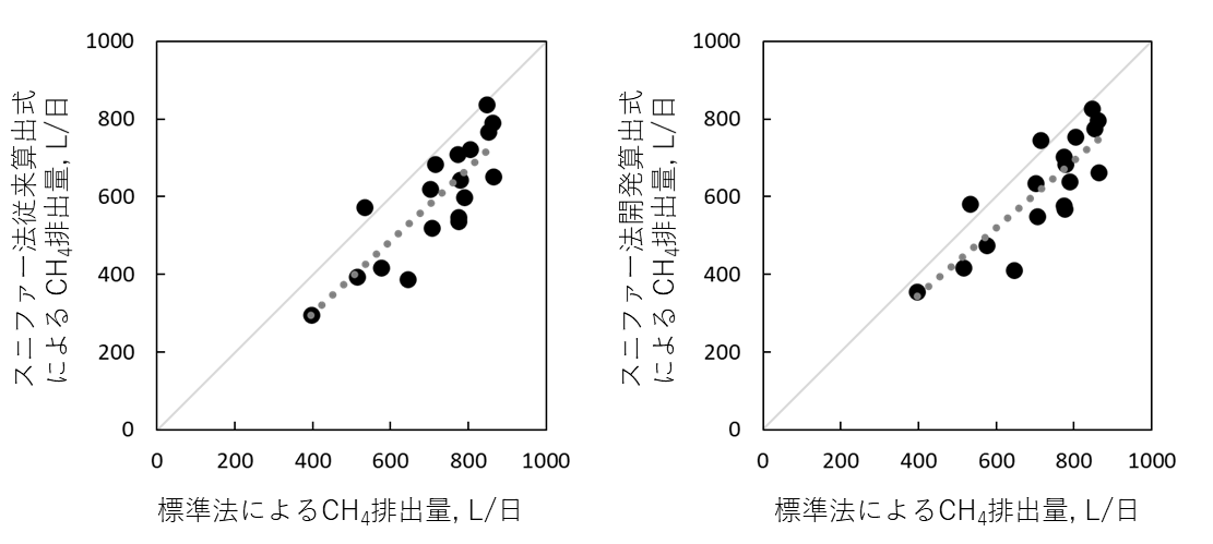 図2 従来算出式あるいは開発算出式を用いるスニファー法と標準法で測定されたメタン(CH4)排出量の関係
