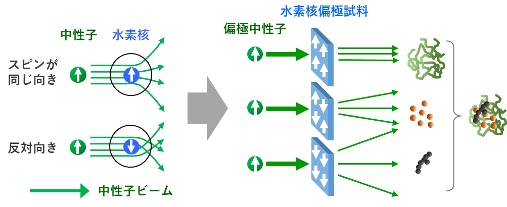 スピンコントラスト変調法は、中性子の水素核に対する散乱が互いのスピンの向きによって大きく異なる性質を利用した構造解析法です。スピンコントラスト変調中性子小角散乱法では、スピンを揃えた中性子ビーム(偏極中性子)のスピン方向に対する試料中の水素核スピンの整列度(水素核偏極度)によって変化する複数の偏極中性子散乱から、多成分によって構成される複合材料中の複数の散乱成分を識別してそれぞれのナノ構造を決定できます。