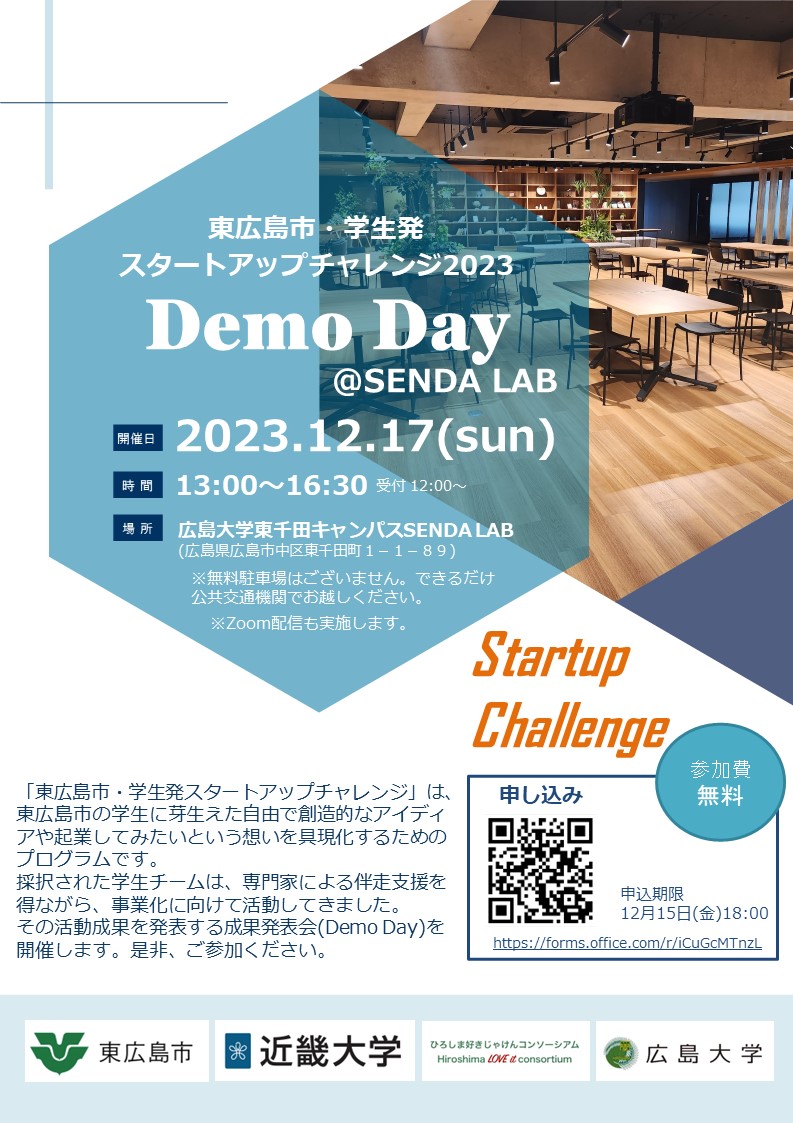 2023年12月17日(日)に、「東広島市・学生発スタートアップチャレンジ2023」に採択された10課題の成果発表会(Demo Day)を開催します。