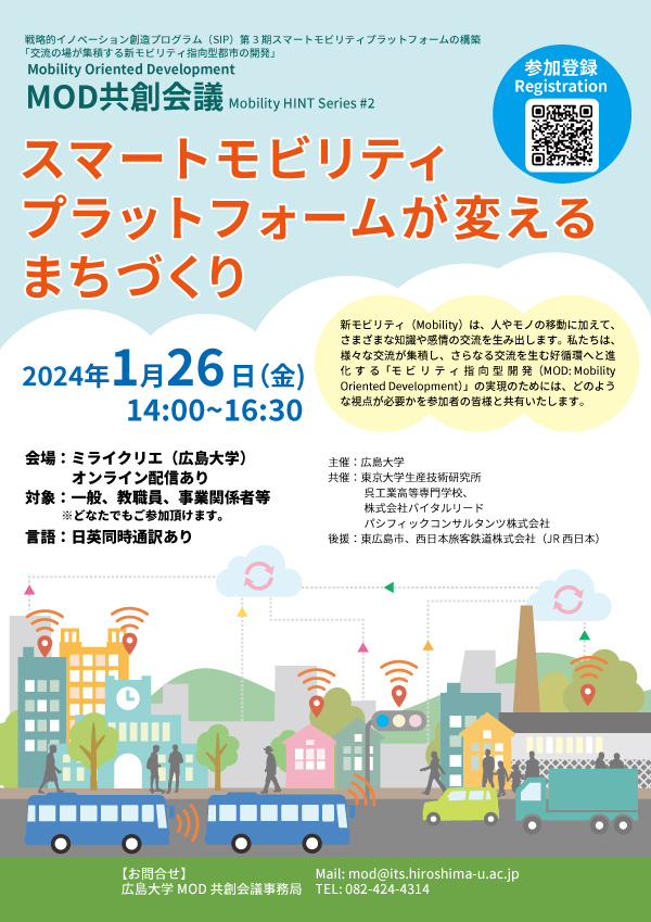 戦略的イノベーション創造プログラム(SIP)第3期『スマートモビリティプラットフォームの構築』「交流の場が集積する新モビリティ指向型都市の開発〜モビリティのリ・デザインによる15分都市の実現〜」(研究総括責任者 藤原章正 教授)は、2024年1月26日(金)にMOD共創会議を開催します。本事業は、広島大学、呉高等専門学校、東京大学生産技術研究所、株式会社バイタルリード、パシフィックコンサルタンツ株式会社の共同提案です。