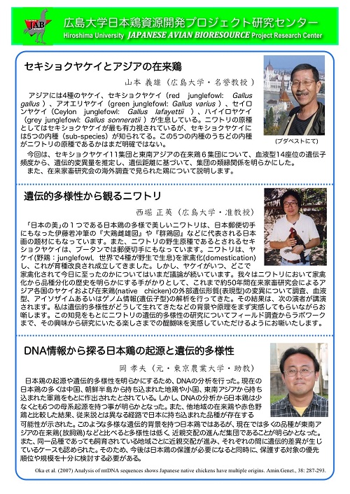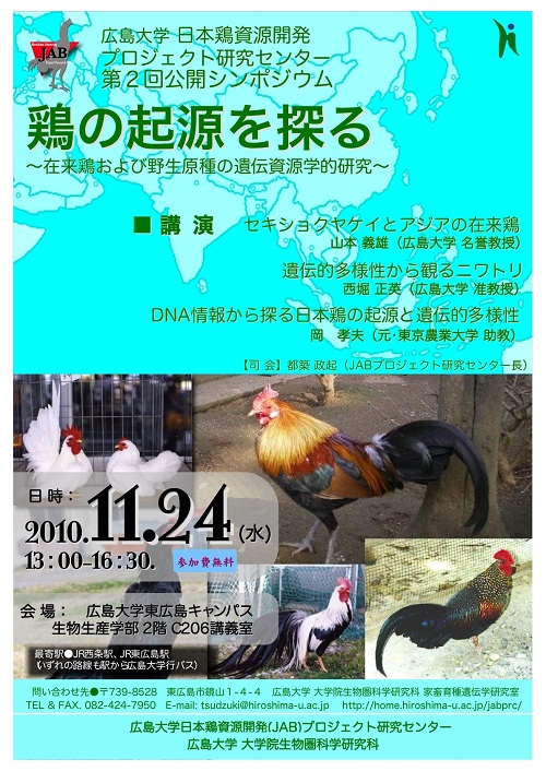 広島大学日本鶏資源開発(JAB)プロジェクト研究センターは、下記のとおり、第2回公開シンポジウムを開催します。