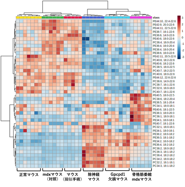 骨格筋特異的Gpcpd1欠損マウスや骨格筋が萎縮する二つのマウスでは22:6と表記されたDHAを含有するPCが低いなど、PCの組成が極めて似ていた。