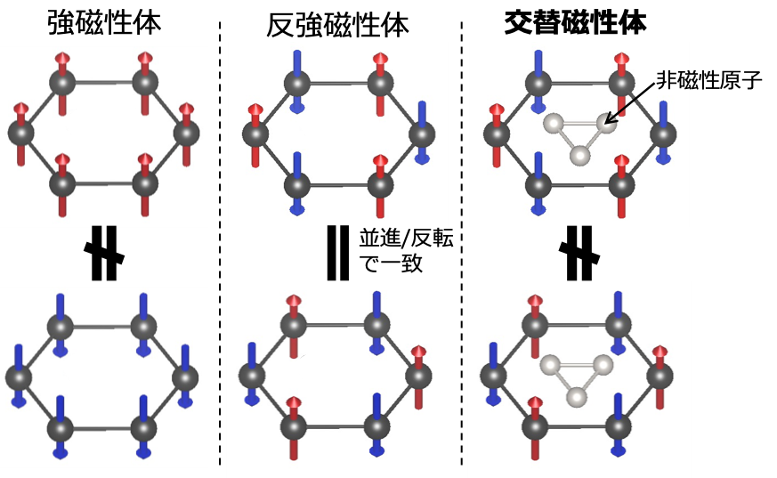 図1:交替磁性体の概念図。スピンが平行に並んだ強磁性体では、↑と↓の状態は並進操作や反転操作によって一致しないため、区別することが可能です。赤色と青色のスピンが反平行に並んだ反強磁性体では、(↑ ↓)と(↓ ↑)の状態が並進または反転操作によって一致します。交替磁性体では、反平行に並んだスピンと特殊な非磁性原子の対称性によって、(↑ ↓)と(↓ ↑)の状態が区別可能となります。