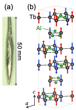 本研究では、Tbイオンがハニカム構造を組む金属間化合物TbPt6Al3の純良単結晶試料を、広島大学院先進理工系科学研究科の磁性物理学研究室に設置された高周波加熱炉を用い、チョコラルスキー法(3)によって作製しました (図1(a))。この単結晶試料の磁性と電気伝導の性質を、同大学自然科学研究支援開発センターに設置された断熱消磁冷凍機を用いて、0.1 K以下の極低温まで調べました。さらに、英国ラザフォード・アップルトン研究所の高分解能チョッパー型中性子(4)分光器MARIおよび東北大学金属材料研究所の中性子粉末回折装置HERMESによって、TbPt6Al3の磁気構造を決定しました。