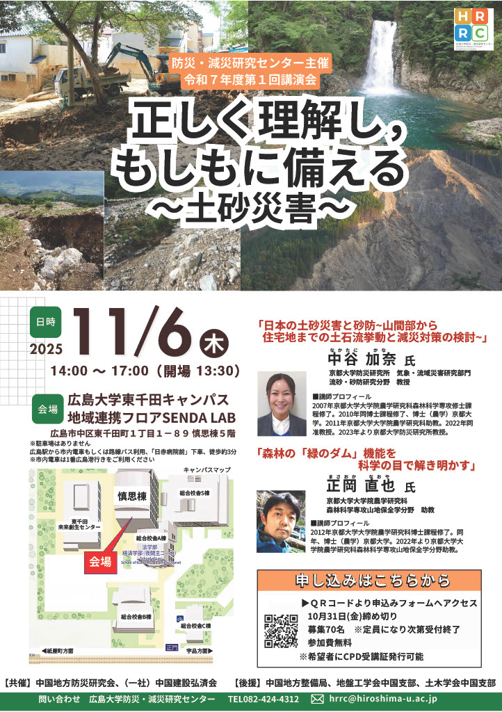 講師をお迎えし、防災・減災研究センター主催 令和7年度第1回講演会「正しく理解し,もしもに備える~土砂災害」を開催します。