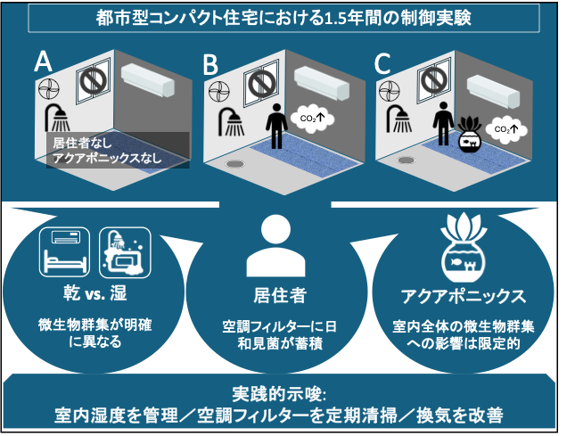 人が多くの時間を過ごす屋内環境において、微生物群集は居住者や建築環境(湿度、換気、表面特性)など多様な要因により構築される。特に日本の都市部に多い高気密の住宅では、微生物曝露※5のリスクが高まる可能性がある。一方で、従来の研究は多くが一般住宅調査研究に限られ、環境因子を統制した定量的評価は限られていた。