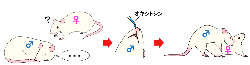 3週間の性行動トレーニングを経ても射精経験のない性的不活発な雄ラットに対して、オキシトシンを経鼻投与することで自然な性行動が誘発されました。投与により行動開始までの時間が短縮され、行動頻度も増加することが観察されました。これらの結果から、オキシトシン経鼻投与には「眠れるラットを起こす」ような強い行動促進効果があることが明らかとなりました。