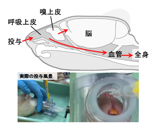 下部写真は雄ラットへのオキシトシン経鼻投与実験の様子です。ラットは頭部を10°下向きに傾けた状態で麻酔マスクを装着し、薬液を鼻腔内に投与しています。この方法により血液脳関門を回避して効率的に薬物を脳に送達できます。