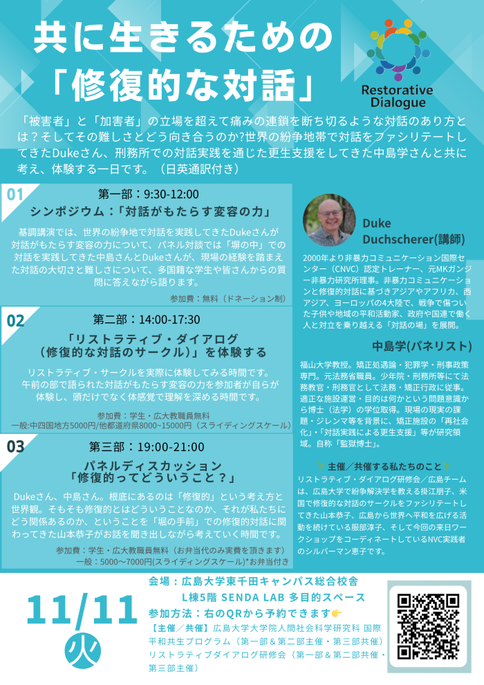 「被害者」と「加害者」の立場を超えて痛みの連鎖を断ち切るような対話のあり方とは?そしてその難しさとどう向き合うのか?世界の紛争地帯で対話をファシリテートしてきたDukeさん、刑務所での対話実践を通じた更生支援をしてきた中島学さんと共に考え、体験する一日です。(日英通訳付き)