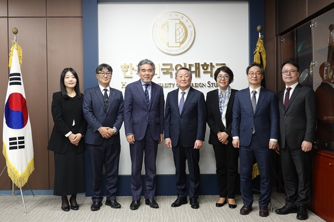 訪問に際しては、韓国外国語大学の パク・ジョンウン 学長、キム・ミンジョン対外協力担当副学長、ヤン・ジェワン国際交流院長、ムン・チャンハク日本言語文化学部・学部長ら関係者の皆様より温かい歓迎を受けました。韓国外国語大学からは、ソウルおよびグローバルキャンパスを中心に45か国語以上の教育プログラムを提供する国際的な大学として、多文化的環境の中で優れた語学教育・地域研究を展開してきたこと、さらには年間2,000人規模の留学生の受け入れや、AI・融合分野を見据えた教育改革など、国際教育の拡充に向けた先進的な取り組みが紹介されました。