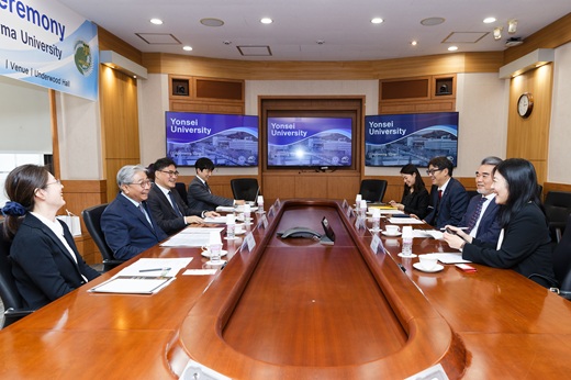 締結式では、延世大学のユン・ドンソプ学長、キム・ヨンチャン国際担当副学長をはじめとする関係者の皆様から温かい歓迎を受けました。続く意見交換では、延世大学側より、ソウルを含む3キャンパス体制の下、約4万人の学生と7,000人規模の教職員を擁する総合大学として、多様な分野で国際的な教育・研究活動を展開していることが紹介されました。また、年間6,000人を超える留学生の受け入れに加え、国際サマースクール/ウィンタースクールなどの短期プログラムにも注力している点、さらにはIBMスーパーコンピュータを活用したAI・デジタル分野の国際共同研究など先進的な取り組みについても共有されました。