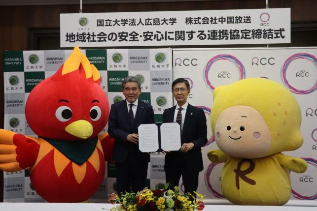 2025年12月15日、広島大学は、東広島キャンパス法人本部棟において、越智光夫学長および株式会社中国放送 宮迫良己代表取締役社長の出席のもと、株式会社中国放送(RCC)と「地域社会の安全・安心に関する連携協定」を締結しました。