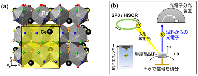 図1 CeRu2Al10の結晶構造、ARPES実験のセットアップ