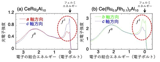 そこで国際共同研究グループは、CeRu2Al10およびCe(Ru1-xRhx)2Al10について、広島大学放射光科学研究所(HiSOR)のビームラインBL-1でARPES実験を行い、c-f混成に異方性があることを見いだしました。さらに、理研放射光科学研究センターSPring-8のビームラインBL12XUとBL12B2において実施した分光実験とX線回折実験の結果を合わせて、電子構造の変化、いわゆるリフシッツ転移がRh置換によって起きていることを明らかにしました。