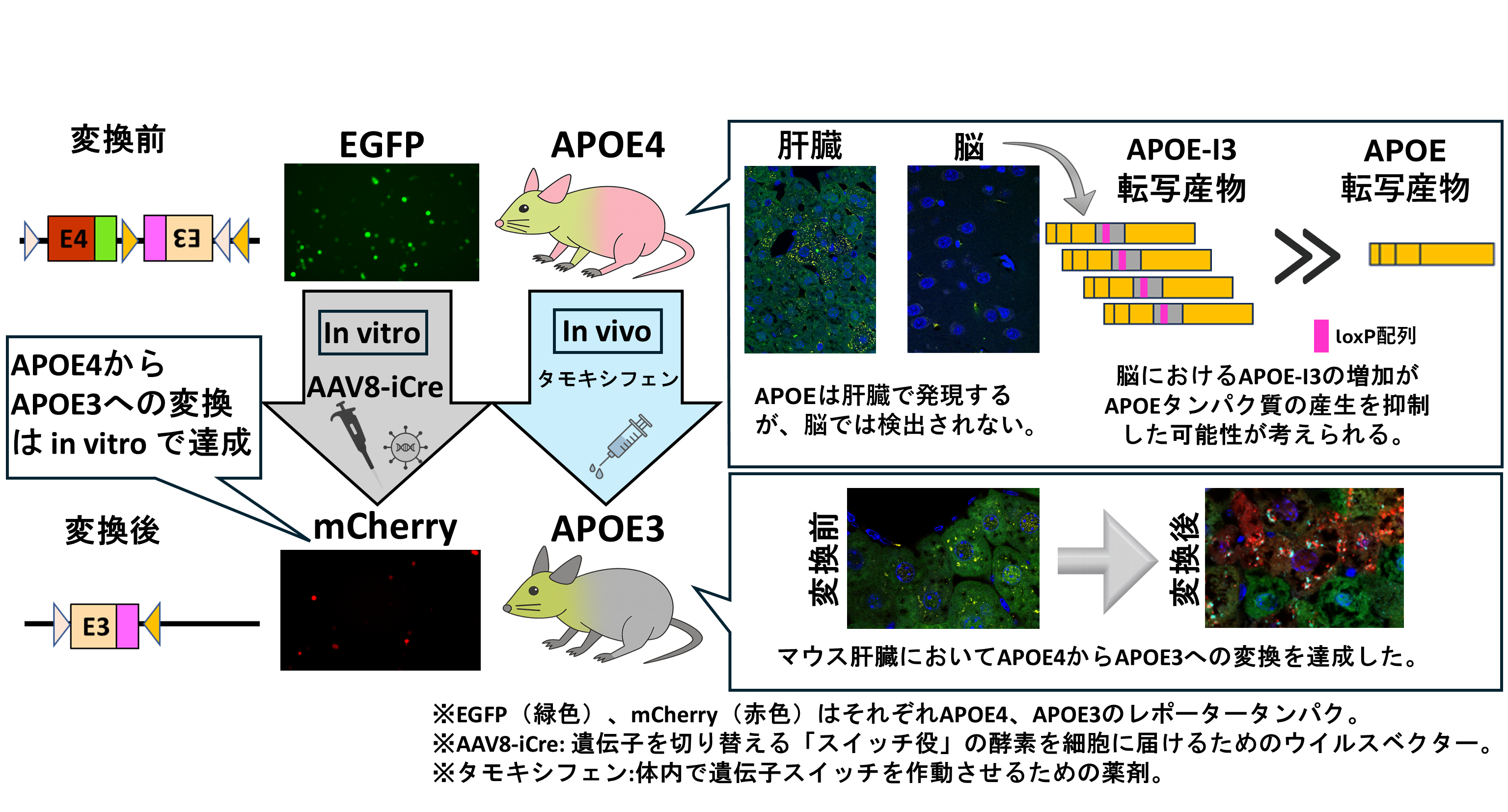本研究では、体内でAPOE4からAPOE3に切り替えることができるマウスモデルの作製に成功しました。