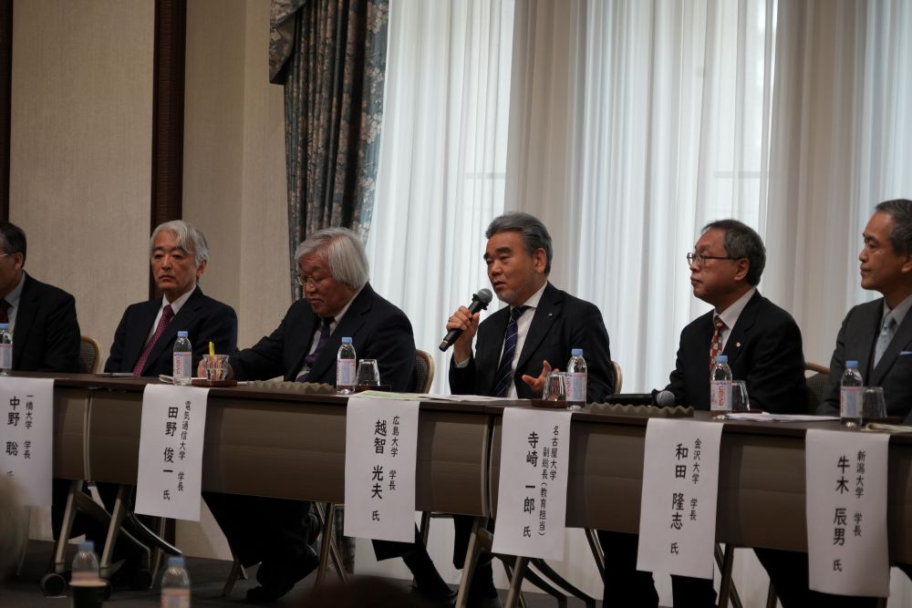 続く総合質疑・意見交換セッションには、採択6大学および連携2大学から、牛木辰男新潟大学長、和田金沢大学長、寺崎一郎名古屋大学副総長(教育担当)、越智光夫広島大学長、田野俊一電気通信大学長、中野聡一橋大学長、寺野稔北陸先端科学技術大学院大学長、井関俊夫東京海洋大学長の8人が登壇しました。