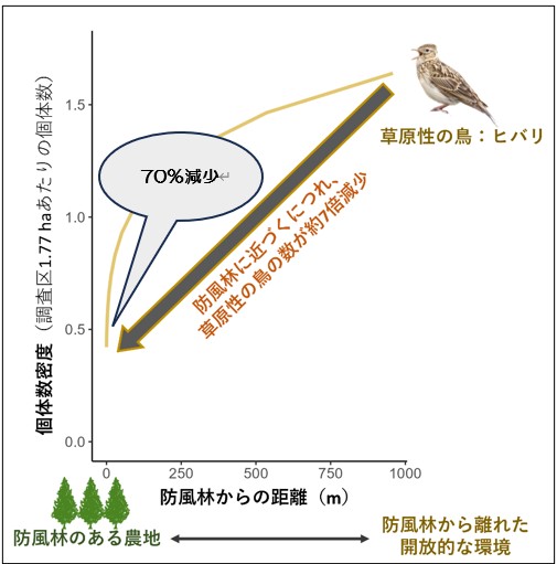 - 草原性鳥類は、防風林に隣接する地点では、防風林から約1km離れた開放的な環境に比べて、個体数が約70%少ないことが分かりました。