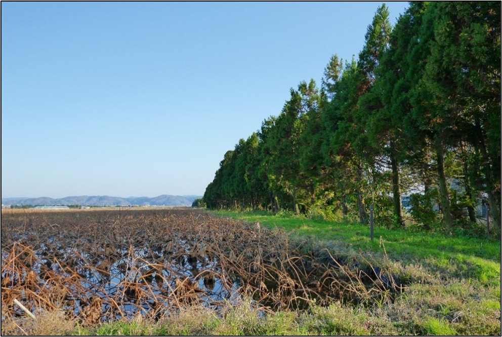 石川県河北潟のハス田に隣接して設けられた防風林の例。農地の風害対策として設置された防風林は、林や藪を利用する鳥類のすみかになる一方で、広く見通しのよい環境を必要とする鳥類にとっては、生息地利用の妨げの要因となることがある。