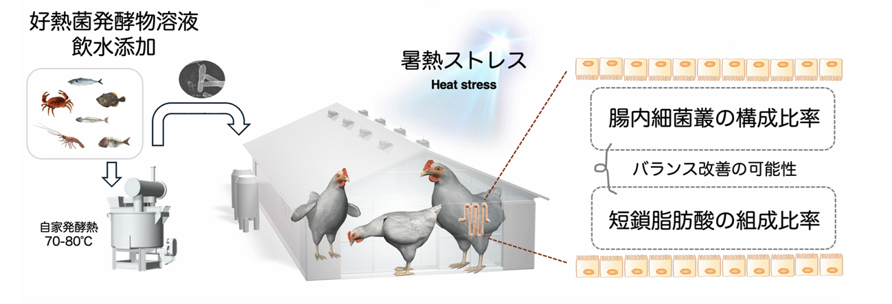 理化学研究所(理研)生命医科学研究センター粘膜システム研究チームの大野博司チームディレクター、宮本浩邦客員主管研究員、環境資源科学研究センター環境代謝分析研究チームの菊地淳チームディレクター、黒谷篤之特別研究員(研究当時)、光量子工学研究センター光量子制御技術開発チームの守屋繁春専任研究員、和田智之チームディレクター、九州大学大学院農学研究院の山野晴樹大学院生、髙橋秀之准教授、広島大学大学院統合生命科学研究科の稲生雄大助教、北里大学医療衛生学部血液学研究室の佐藤隆司講師らの共同研究グループは、累積60万羽を超える採卵鶏の大規模調査の結果、高温環境下での鶏の死亡率を下げる飼育管理手法として好熱菌[1]群を活用した高温発酵飼料を溶液にして投与することが効果的であり、腸内環境の変化が暑熱ストレス耐性に関与し得ることを確認しました。