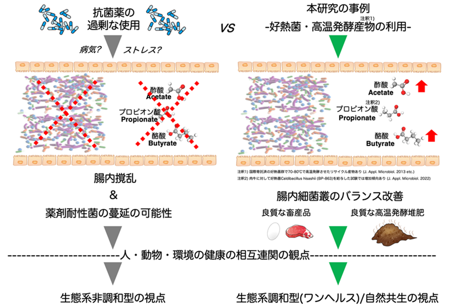 右)生態系調和型(ワンヘルス)/自然共生の視点。本研究の結果と過去の知見により、腸内細菌叢と短鎖脂肪酸(酢酸・プロピオン酸・酪酸)の機能性を損なわないことを示している。