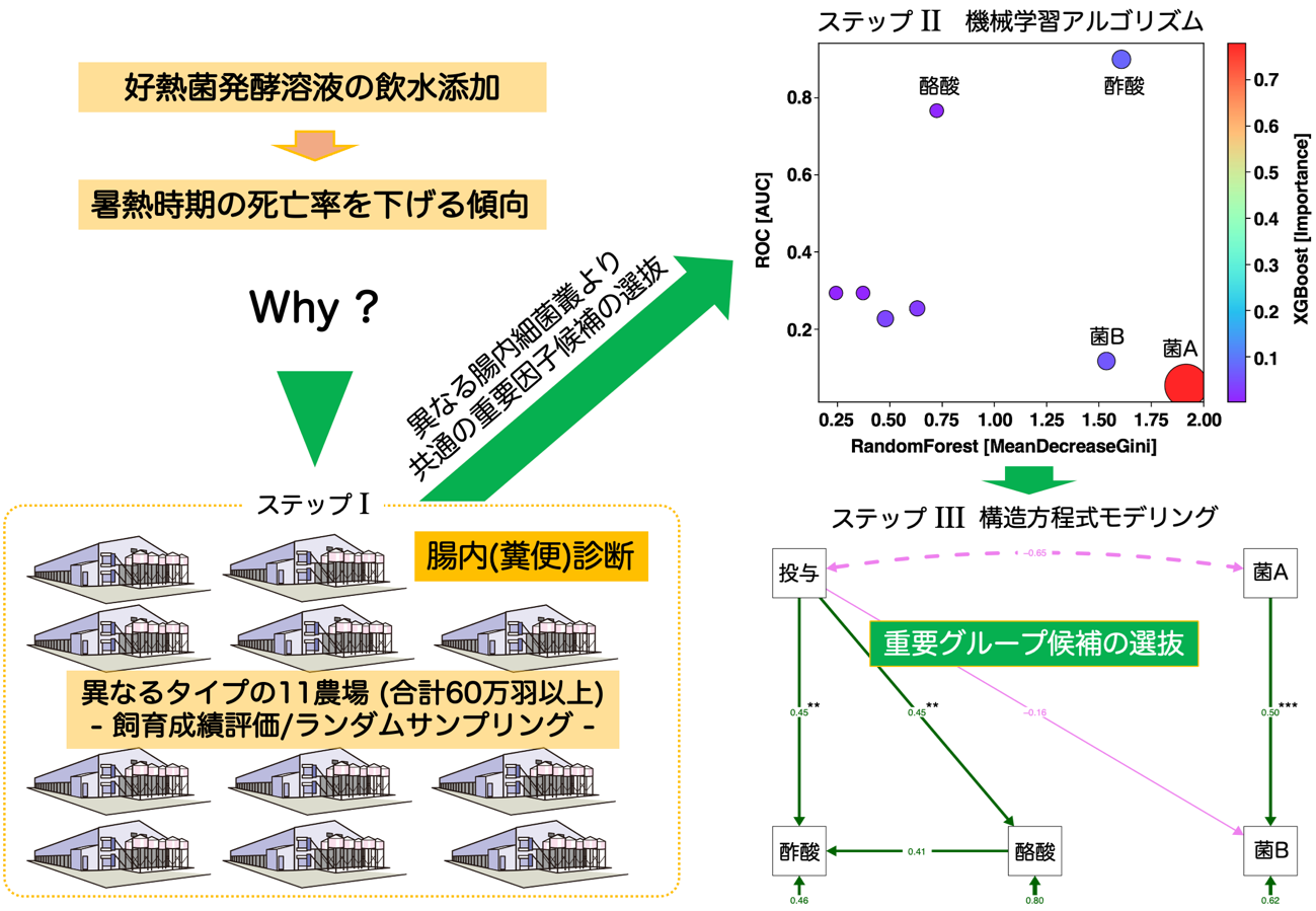 地球温暖化がますます加速する中で、生命を脅かす暑熱ストレスが看過できなくなっています。「人」と「動物」と「環境」を包括的に捉えて守る「One Health(ワンヘルス)[2]」という概念の重要性が国際的に強調される中で、さまざまな分野で環境配慮型の新たな持続可能技術の開発が求められています。本研究では、高温発酵技術を活用することで、暑熱ストレス環境で飼育した鶏の死亡率が下がることを見いだすとともに、実際に糞便(ふんべん)を対象とした計算科学的なアプローチによって、高温発酵飼料が腸内細菌叢の構成比率と短鎖脂肪酸[3]の組成比率のバランスを改善している可能性を明らかにしました。