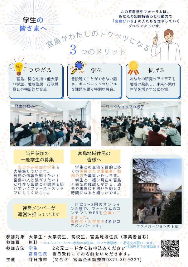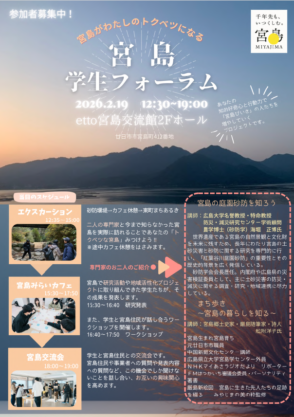 今回のイベント「宮島学生フォーラム」では、「宮島みらいカフェ」の枠で研究活動や地域活性化プロジェクトについて成果発表を行います。
