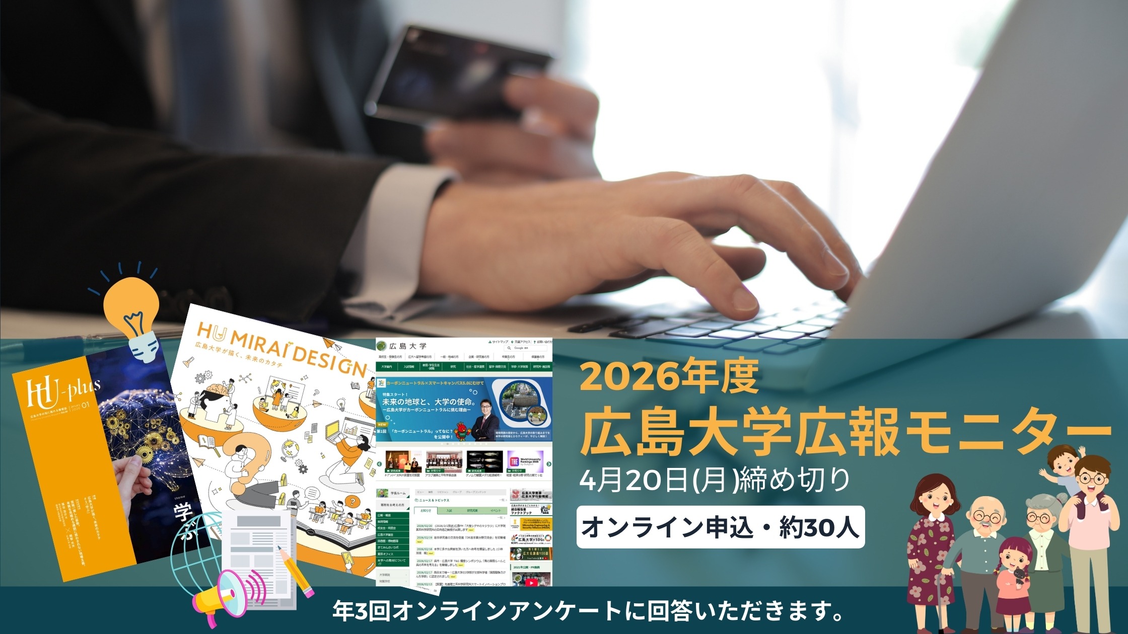 広島大学が行う広報活動に対して、学外の皆さまの声を取り入れるため「広報モニター」を募集します。
