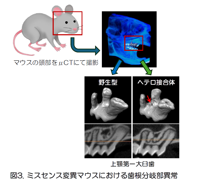 • 鎖骨等の未発達や無形性により発症する鎖骨頭蓋異形成症(※1)の患者さんと同じタイプのRunx2(※2)ミスセンス変異(※3)を持つマウスモデルの系統を確立しました。このマウスを用いて、骨や歯の根が分かれる過程にも異常が生じることを明らかにしました。