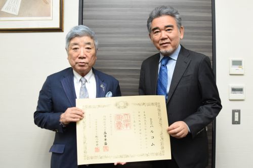 広島大学基金へ多額の寄附をいただいた株式会社バルコム様に2025年11月22日付で紺綬褒章が授与されました。2026年3月26日、団体に授与される褒状を伝達させていただきました。