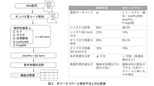本研究では、シイタケおよびダイズさび病菌のトランスクリプトームデータを用いて開発したワークフローを評価し、転写産物から予測されたタンパク質コード配列(※5)の96%以上に機能注釈を付与することに成功した。これは、遺伝子がどのようなタンパク質を作り、どのような生物学的役割を持つのかを推定するものである。また、特定の条件でのみみられる転写産物や、近縁種でも発見されている転写産物など、従来手法とは異なるアプローチでの注釈も可能になっている。