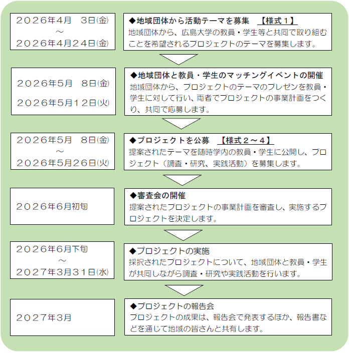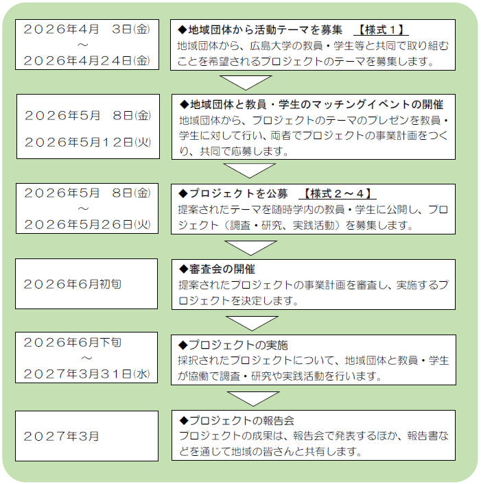 この事業は、地域社会や地域経済の維持や活性化などの様々な課題について、地域社会で課題の解決に取り組んでいる団体から広島大学に対して提案をいただき、そうした課題へ取り組む意向がある広島大学の教員・学生と地域団体との協議の上で、調査・研究活動や実践活動などに取り組むものです。