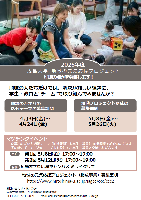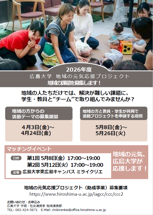 広島大学の学術的な蓄積や教員・学生等の力を活用し、地域社会が直面する課題の解決や地域の活性化のために貢献することを目的とした、「2026年度広島大学地域の元気応援プロジェクト」事業をスタートします。