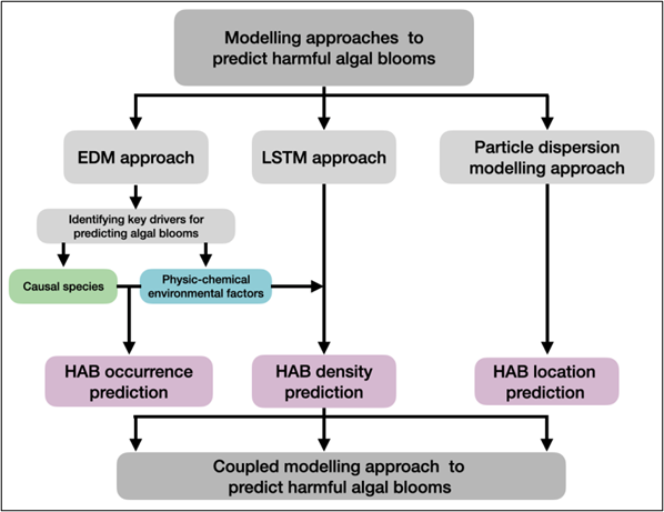 3. 経験的動的モデル(EDM):30年間にわたる長期植物プランクトンモニタリングデータを用いて、HAB原因種と他の植物プランクトン種との因果関係を同定し、この関係を利用することでHABの発生を予測できます。