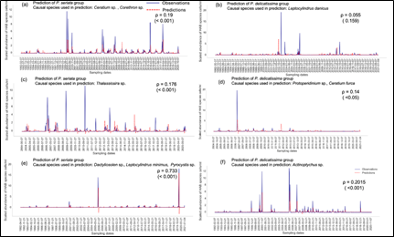 Multivariate S-map法により因果種を用いて予測された Pseudo-nitzschia 属の種群。予測精度は、ピアソン相関係数および p 値によって評価した。サブプロット(a, b)は Quellón、(c, d)は Melinka、(e, f)は Metri における結果を示す。