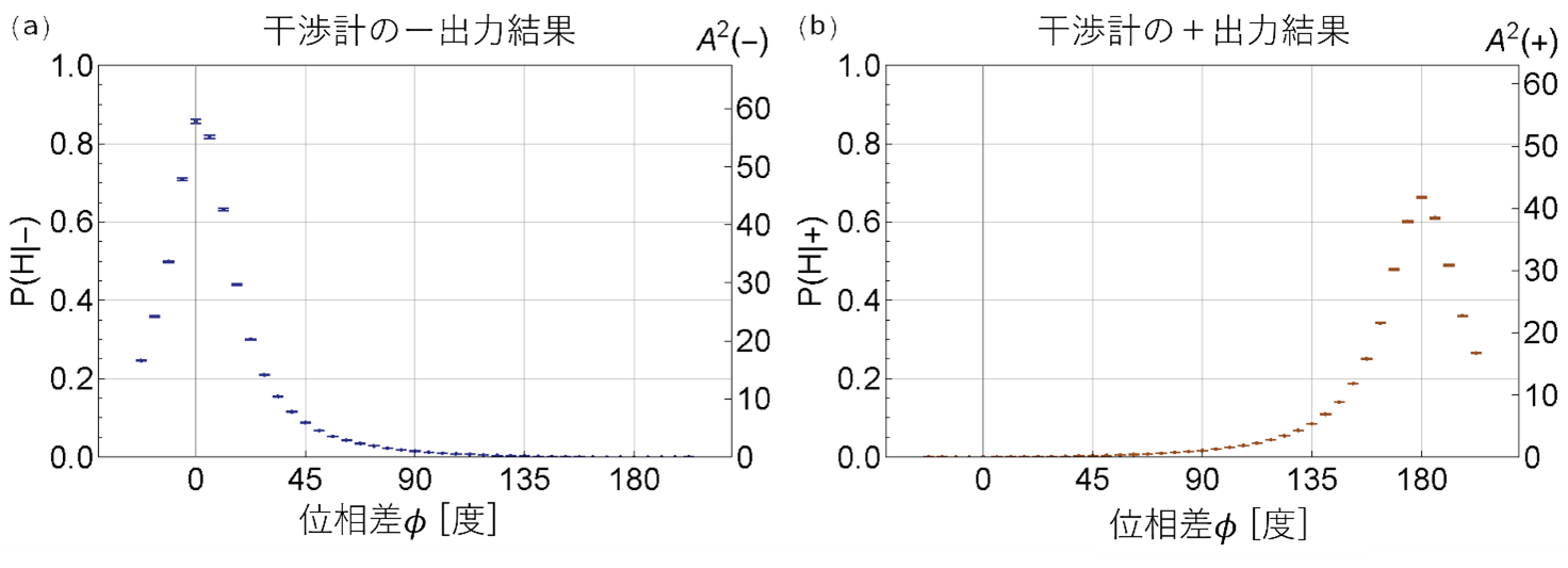 単一光子干渉の物理的解明は、長い間、量子重ね合わせ状態の数学的表現をそのまま物理的に解釈することで解決できると考えられてきました。この考えに従えば、単一光子は粒子として二つの光路に「同時に」存在する状況にあることを意味します。そこで我々は最近の量子測定の知見(*5)を単一光子干渉計の実験に適用しました。干渉計内部の二つの光路間での光子数の差を偏光に埋め込み、一方だけ出力した光子の偏光を測定することで、実際に伝播した二光路間での光子数差の二乗を連続量として得ることに成功しました。強め合いの干渉では二光路間の位相差に依存して光子数差が0から1未満の値を得たため、これは光子が二つの光路に広がった状況、つまり非局在を示します。また弱め合いの干渉では、位相差に依存して光子数差が1を超えて7ぐらいまで増大したため、これは一方の光路に1を超える複数の光子が局在し、もう一方の光路では負となる状況、超局在を示します。それらの境目では、光子数差が1と等しくなり、これはどちらか一方の光路に単一光子が局在した状況を示します。これらの結果から、出力確率の干渉パターンは物理的には波の干渉ではなく、超局在が非局在よりも起こりにくいという単純な理由から説明できること、また光子数差が干渉の測定に依存することから、単なる実在論の否定ではなく、測定に依存した実在論を示していることが分かりました。本研究の成果は一般の重ね合わせ状態の物理的理解に貢献するだけでなく、位相差の精密測定に応用されることが期待されています。