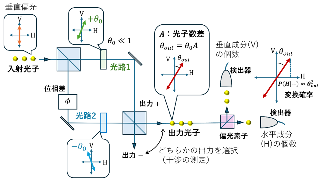 単一光子干渉計内部を観測することは、量子重ね合わせ状態の光子が二つの光路をどのように伝搬しているのかを探ることでもあります。このとき最も重要な情報は、二光路間での光子数差です。この値を測定するために、図1のように二光路間の位相差φを決定してから干渉の測定(出力のどちらか一方を選択)後、選択した出力ポートからの光子の偏光を測定しました。垂直偏光の光子を干渉計に入射させ、干渉をあまり壊さないように、それぞれ二光路での偏光をお互い逆方向にわずかに回転させます(+θ0と−θ0)。これは光路を表す物理量を光路1のみを通過した時の値を+1、光路2のみを通過したときの値を-1として定義した場合、値とθ0との積に対応します。光子が光路1のみを通過した場合は、出力光子の偏光回転角は+θ0、光路2のみを通過した場合は、出力光子の偏光回転角は−θ0となります。このとき二光路間での光子数差は1で偏光回転角の“大きさ”はθ0です。もし初期重ね合わせ状態が等分配で二つの光路に広がって伝播したとき、光子数差はゼロで、偏光回転角もゼロです。つまり光子数差の“大きさ”は出力された光子の偏光回転角の“大きさ”に埋め込まれています。これを取り出すために、水平偏光への変換確率を利用します。この変換確率は偏光回転角の大きさの二乗にほぼ等しいため、この確率を測定してθ02で割れば、光子数差の二乗の“大きさ”が得られます。これは干渉の測定後に干渉計内の光子の伝播の痕跡をたどることになるため、物理量の値を用いた議論が可能になります。