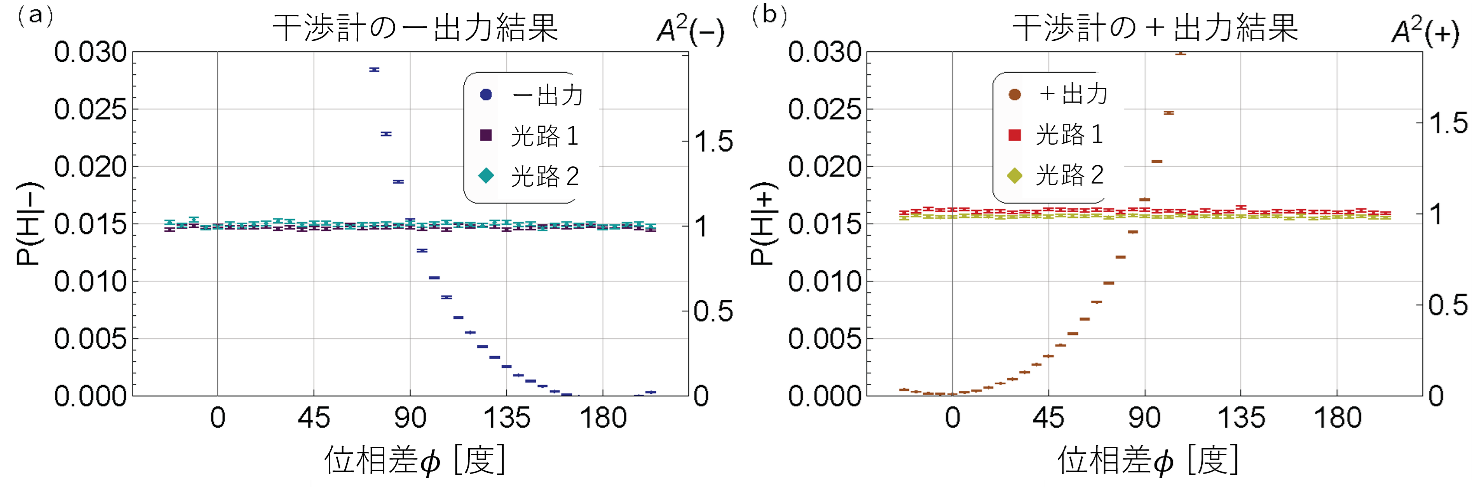 図2:実験結果(表示“光路1”,“光路2”は、光路1のみ、光路2のみを通過させたときの実験結果、”-出力“と”+出力“は干渉させたときの実験結果を示す。)