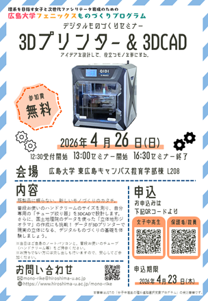 この度、広島大学ものづくリケジョでは、2026年4月26日(日)に、広島大学東広島キャンパスにて、デジタルものづくりセミナー「3Dプリンター&3DCAD」を開催します。