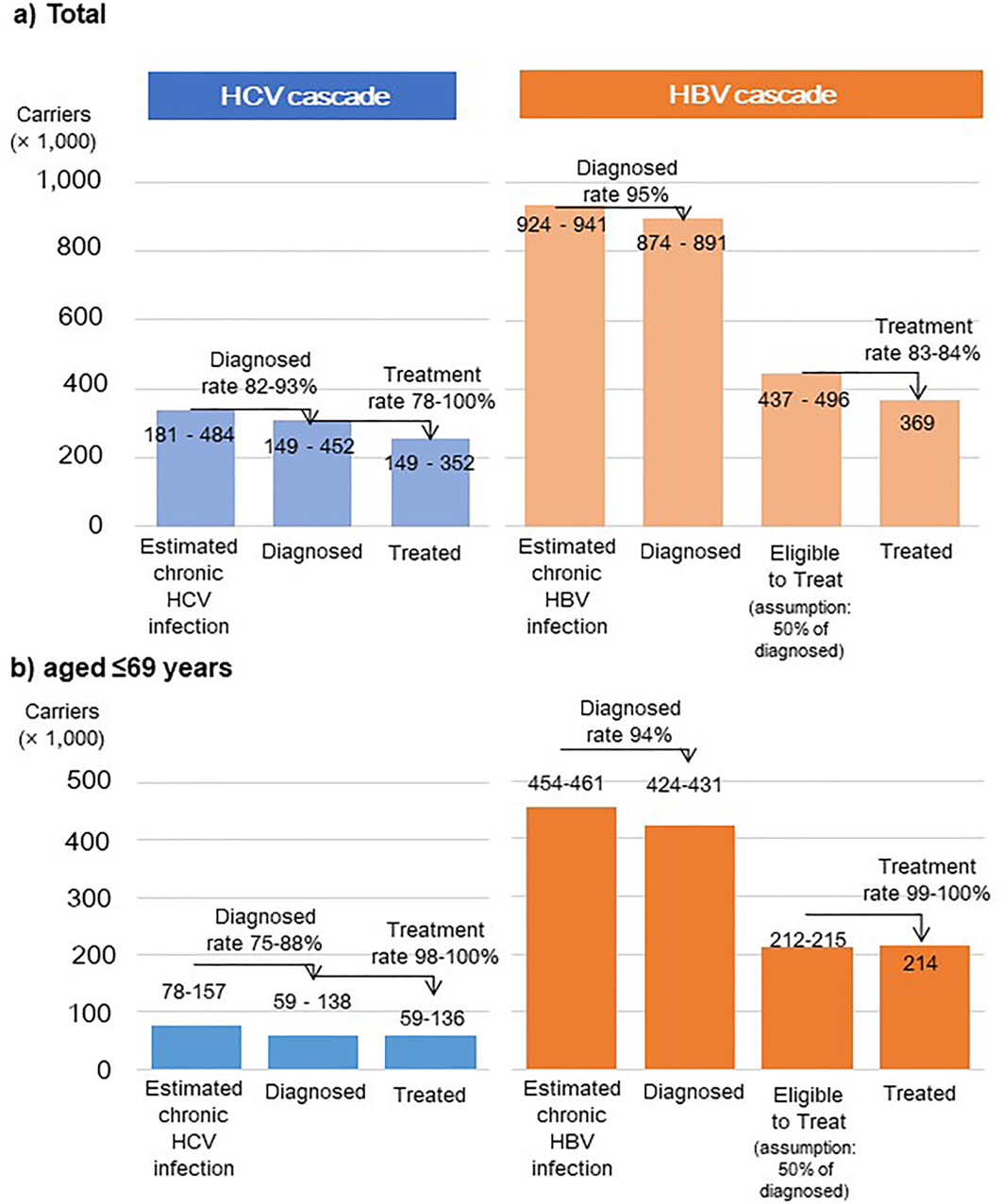 ・ その結果、日本では診断率(diagnosis rate)はHBVで約95%、HCVで82–93%、治療率(treatment rate)はHBVで83–84%、HCVで78–100%と推定され、WHOが掲げる肝炎排除目標(診断率90%、治療率80%)を概ね達成していると考えられました。