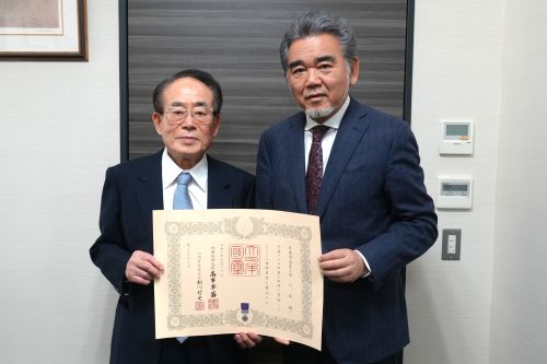 広島大学基金へ多額の寄附をいただいた早川武敏様に2025年12月20日付で紺綬褒章が授与されました。2026年4月23日、個人に授与される褒章及び章記を伝達させていただきました。