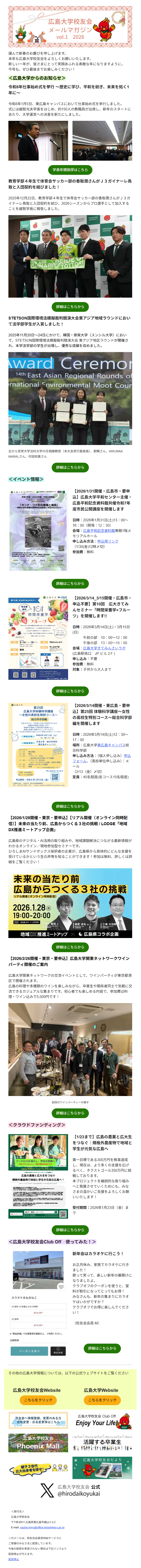 広島大学や広島大学校友会の最新のトピックやイベント、会員特典などを月に1回程度メールでお届けいたします。広島大学の在学生や同窓生はもちろん、広島大学に関心のある方であれば、どなたでもご登録いただけます。ご興味のある方は、「登録する」ボタンをクリックし、「会員用Webサービス」への登録をお願いします。