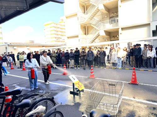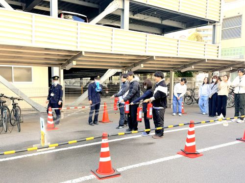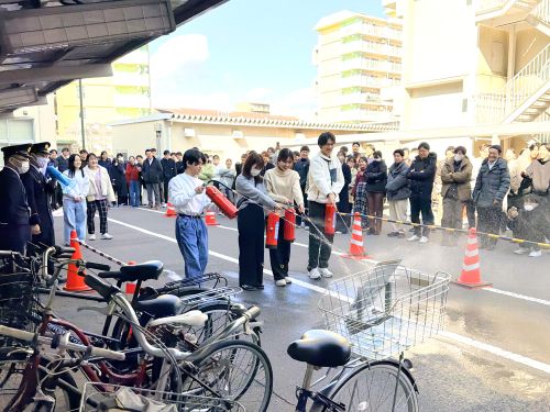 最後に、広島市南消防署のご指導の下、水消火器を使用した消火訓練を行い、消火器を使用する際の流れや、薬剤が火に届くまでの距離感を体感しました。
