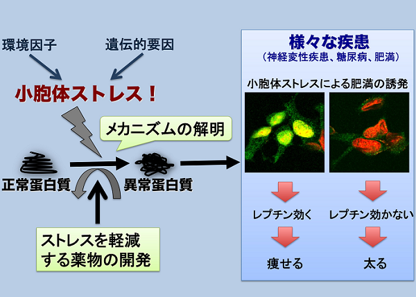 「小胞体ストレス」が病気の原因ならば、小胞体ストレスを軽減できる薬物は病気の治療薬として有効であると考えられます。しかも、このような薬はストレスの根本原因を軽減できる可能性があるため、現在数多く存在する対症療法ではなく根本的療法に貢献できる可能性があります。実際に私達はそのような観点から、新薬の探索を行ったところ、小胞体ストレスを軽減出来る新しい薬物を明らかにすることに成功しました。さらに、その薬物を肥満モデルマウスに与えたところ、肥満を改善させることも明らかにしました。従って、小胞体ストレスを標的とした薬物は将来、生体を健康な状態にもどす新しいタイプの薬として活躍する日が来るかもしれません。