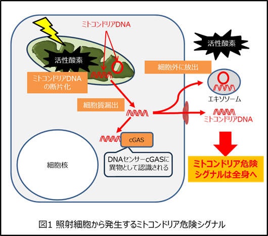 本研究では、正常ヒト線維芽細胞及びマウスモデルを用い、放射線によって生じたミトコンドリア損傷により、ミトコンドリアDNA(mtDNA)が細胞質へ放出される現象に着目しました。その結果、漏出したmtDNAが細胞内DNAセンサーであるcGASに認識され、STING経路を介した炎症反応が活性化されることを示しました。