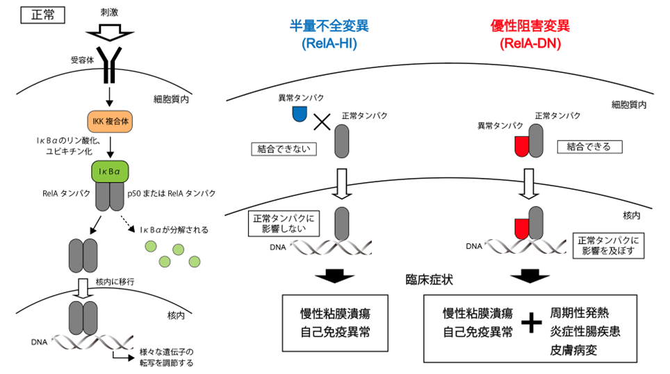 <図1>NF-κBシグナル経路と、RelA異常症における半量不全変異および優性阻害変異が引き起こす病態