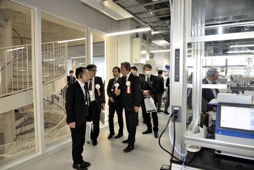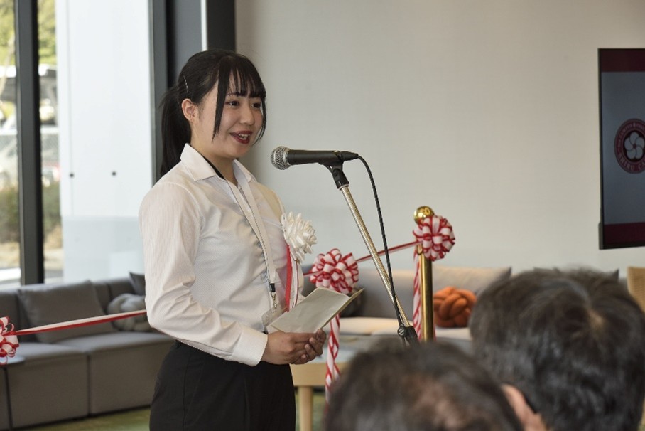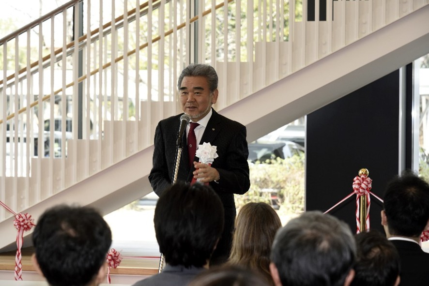 本施設1階ロビーにて挙行された開所記念式典では、文部科学省並びに独立行政法人日本学術振興会、J-PEAKS事業の連携大学である神戸大学などの来賓をはじめ関係者約80人を迎えて、越智光夫学長が開会挨拶し、関係者への謝意を表するとともに、「本施設を通じた、多くの学生、研究者、そして入居する民間企業との繋がりによる産学共創と、新たな発想による研究の活性化」という展望を述べました。