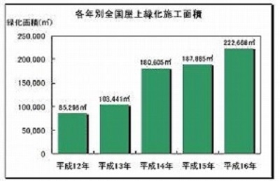 国や地方公共団体の推進などで新聞紙面を飾ることが多くなった屋上緑化。国土交通省は、屋上緑化施工面積(平成12年〜16年分)調査により、5年間で2.5倍以上の増加になったと調査結果を発表しています。
