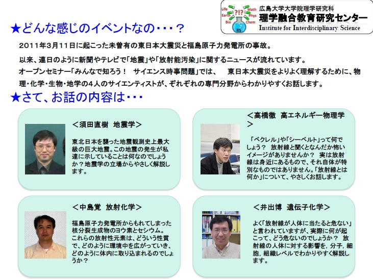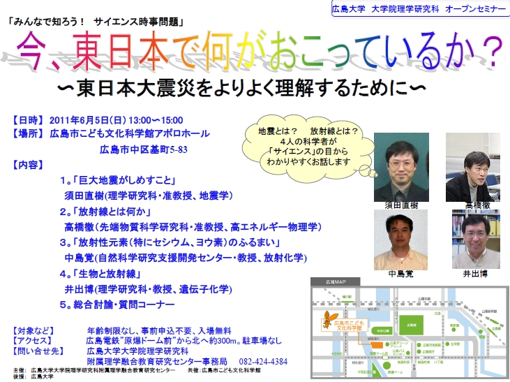 理学研究科では「今、東日本で何がおこっているか?」と題してオープンセミナーを開催し、東日本大震災をよりよく理解していただくために、物理・化学・生物・地学の4人のサイエンティストが、それぞれの専門分野からわかりやすくお話します。