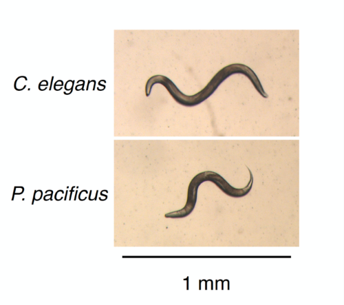 P. pacificusは、C. elegansと比較可能な進化生物学のモデルとして確立された線虫です。自然界では土壌での自由生活性の他に、コガネムシ科の昆虫に乗って移動することが知られています。実験室内では大腸菌を餌として簡単に飼育することができます。また、感覚神経の構造などC. elegansとの様々な比較研究が行われています。