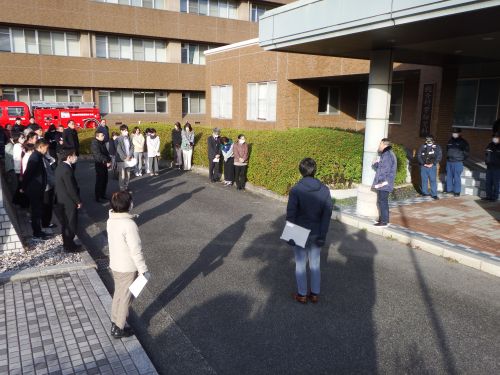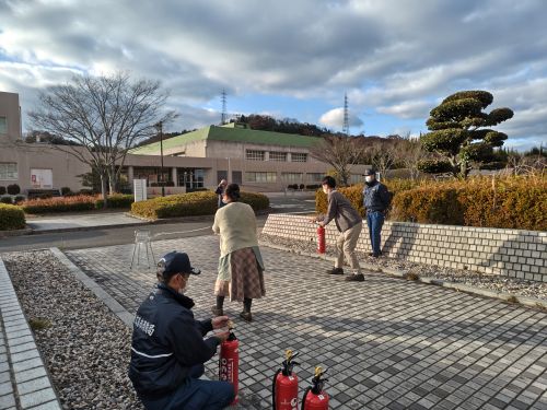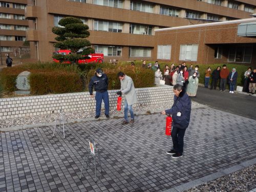 訓練は、3階給湯室にて出火を想定し、通報、初期消火、避難の訓練を行いました。避難完了後、東広島消防署員の指導のもと水消火器による初期消火実地訓練を行いました。